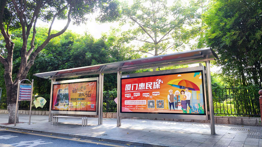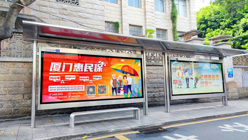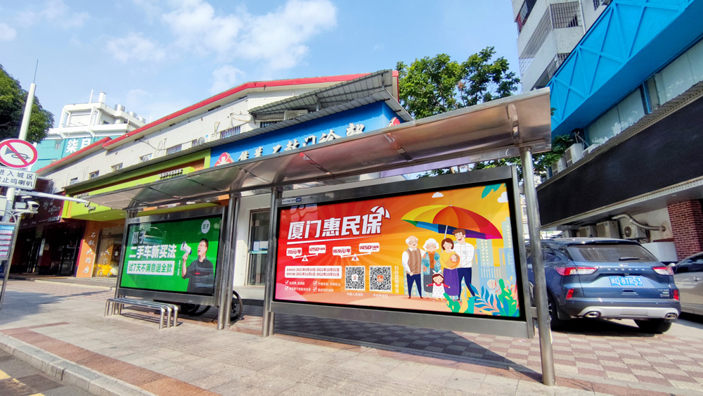 目前“惠民保”在全廈門市島內(nèi)外各個主干道及主干道交叉口、黃金的人流車流途徑處、居民生活住宅區(qū)等路段投放多個城市路名牌、公交車候車亭。